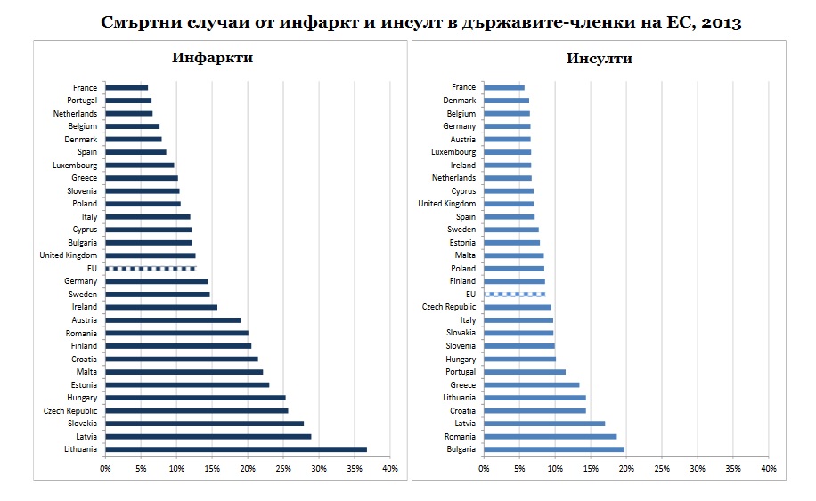 Ситуацията обаче се влошава за Литва, Чехия, Унгария и Хърватия, които единствени отчитат повече починали от инфаркт (ръстът е между 2,9 и 4,3 процента). Само в България, Литва и Словакия е регистрирано увеличение и на смъртните случаи от инсулт, като и в двете страни те са с 0,9% повече спрямо 13 години по-рано.