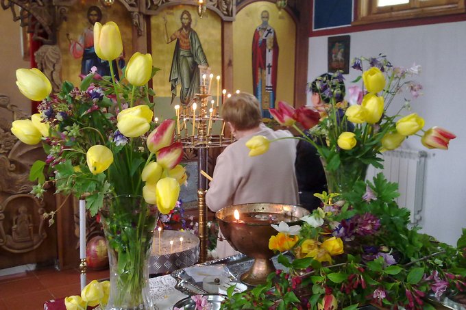 Сутринта, разбира се, има празнична литургия в църквата, потънала в лалета, донесени от благочестивите бабки.