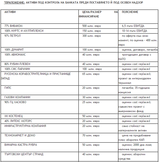 При организирания фалит на банката, който експертите на АликсПартнърс са нарекли евфемистично „оттегляне на депозитите на банката“, естествено тази връзка се скъса и голяма част от основните активи – Виваком, НУРТС, Петрол, Техномаркет, Гипс, Инфраструктурна компания, ХК Костенец, Рубин Плевен и др., попаднаха под контрола или на мениджмънта, или на нови кредитори по линия на цесиите в периода на специалния надзор. Друга част пък от т. нар. канали за финансиране като ТЦ - ИМЕ попаднаха под контрола на групата на лъжесвидетеля и основен идеолог на системата „влез - излез“ при осигуряването на необходимото финансиране на компаниите от първата група.