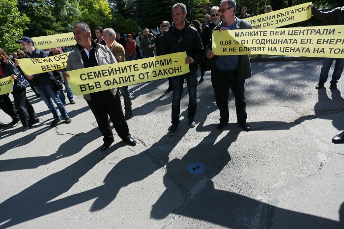 Собственици на малки соларни и вятърни електроцентрали протестираха пред парламента днес. Причината е приет през м.г. нов параграф в Закона за енергетиката, който драстично намали цената на изкупувания от тях ток. Според инвеститорите - голяма част от които семейни фирми, това решение обрича бизнеса им на фалит и оставя без работа над 1800 души, защото те трябва да изплащат кредити за инсталациите, които са отпуснати на базата на законово регламентираните по-високи цени.