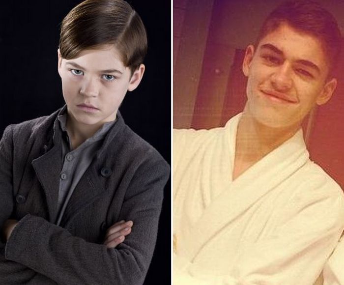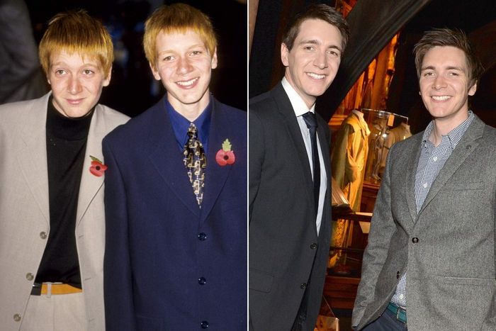 Вляво са 15-годишните Джеймс (Фред Уизли) и Оливър (Джордж Узли) Фелпс на премиерата на първия филм през 2001 г. Вдясно 29-годишните близнаци през 2015 г. В живота братята обичат спорта, особено голфа, често пътешестват по света и се занимават с благотворителни проекти.