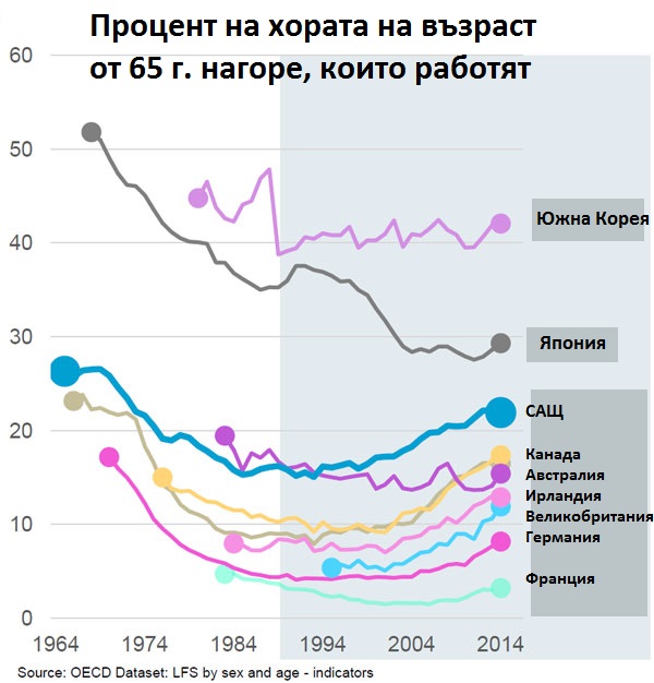 През последното десетилетие пенсионната възраст в големите икономики непрекъснато нараства, но статистиката на Организацията за икономическо сътрудничество и развитие припомня, че преди 50 години в развитите икономики е имало много повече възрастни работещи, отколкото днес.