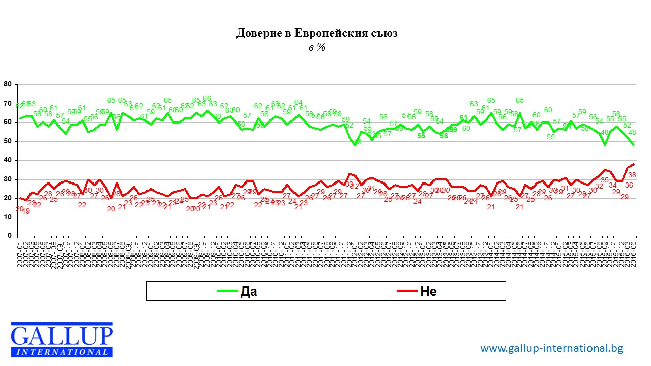 През юни 48% изказват доверие, а 38% - недоверие в ЕС. Останалите се колебаят. В последните месеци подобни стойности не са рядкост. Само до преди няколко месеца обаче картината беше по-благоприятна и доверието се движеше около 60%, а недоверието рядко достигаше 30%, коментират от агенцията.