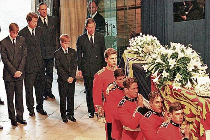 Зад ковчега крачат престолонаследникът принц Чарз и двамата му синове. Техните очи са зачервени.