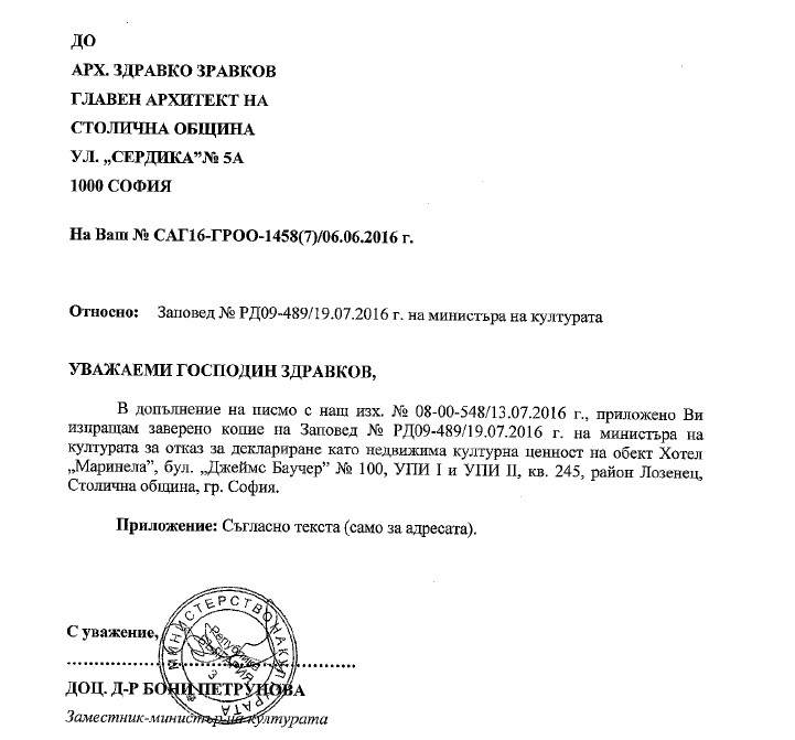 Както Клуб Z съобщи обаче, в края на миналия месец министърът на културата Вежди Рашидов е подписал заповед за отказ за обявяване на хотел „Маринела“ за паметник на културата. На 22 юли главният архитект на София Здравко Здравков е бил информиран за това решение и в законовия срок е обжалвал отказа на Рашидов пред Върховния административен съд (ВАС).