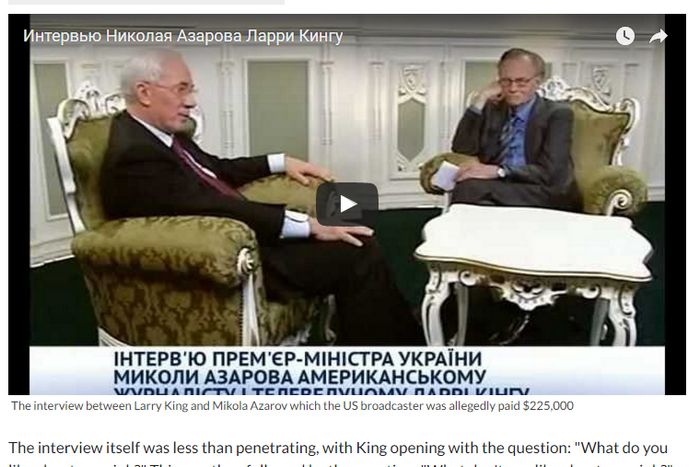 При това интервюто е било много "задълбочено". Първият въпрос е бил: "Какво харесвате във вашата работа?", а вторият "Какво не харесвате във вашата работа?". Премиерът отговарял и на двата въпроса как строят в Украйна футболни стадиони, пише изданието "Интернешънъл бизнес таймс". А когато Лари попитал: "Защо влязохте в политиката", Азаров отговорил: "Това е мъдър въпрос".