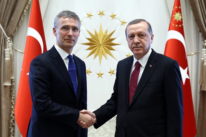 Дори и генералният секретар на НАТО Йенс Столтенберг се снима на фона на червеното знаме, когато посещава Ердоган на 21 април.