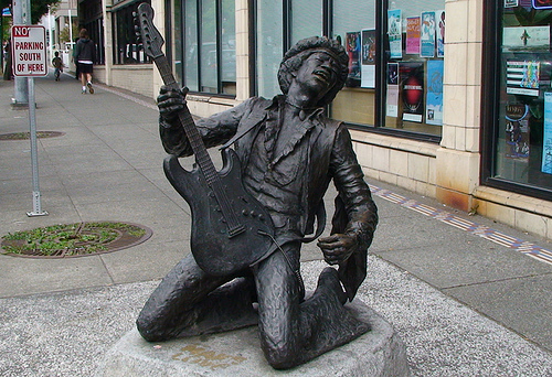Затова и в родината на грънджа Сиатъл пръв "засвири", паднал на колене Джими Хендрикс. Най-известният жител на този град е тук - пред един музикален магазин от януари 1997 г. От години се водят разговори да бъде преместен в кръстения на него Джими Хендрикс Парк, но това така и не се е случило.