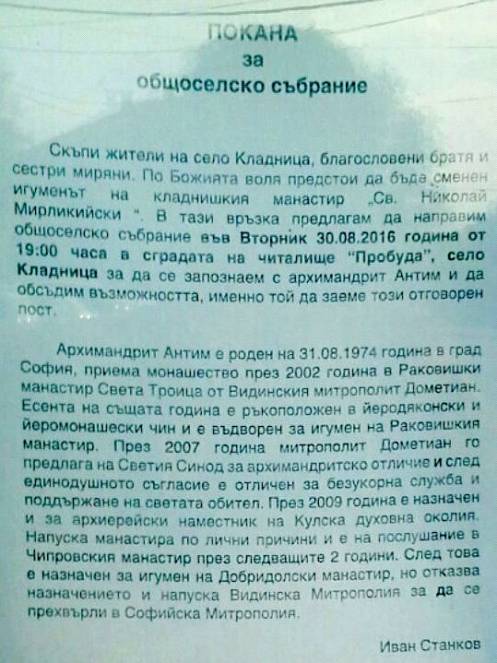 "Общоселско събрание се е провело тази вечер в Кладница, (селото се намира на около 20 км от София, Южна Витоша), на което е била обсъдена и решена смяната на игумена на Кладнишкия манастир йеромонах Рафаил. Събранието е било свикано от местния лидер на ГЕРБ Иван Станков... Активните действия срещу о. Рафаил започнаха преди няколко седмици и са свързани с финансови интереси около ремонта на манастирския храм, пострадал от земетресението през 2012 г., както и с заради социалната и църковно-обществена дейност на игумена, четем още там", четем там.