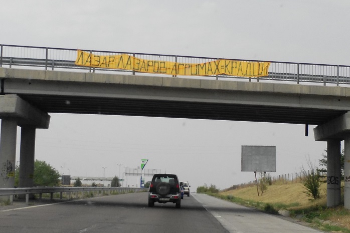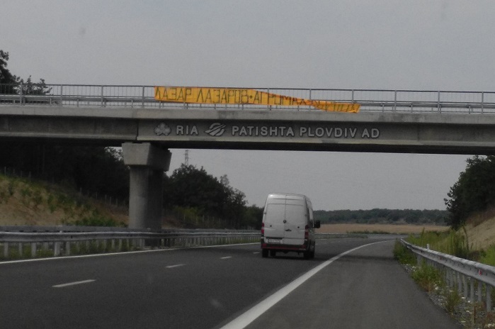 На поне пет от надлезите над магистралите „Марица“ и „Тракия“ са опънати еднакви жълти платнени транспаранти. Върху тях с черни букви пише „Лазар Лазаров + Агромах = крадци“. На някои места платът е заметнат от вятъра над парапета и не се чете целият надпис, но на следващия надлез „сглобяването“ на посланието вече е постигнато.