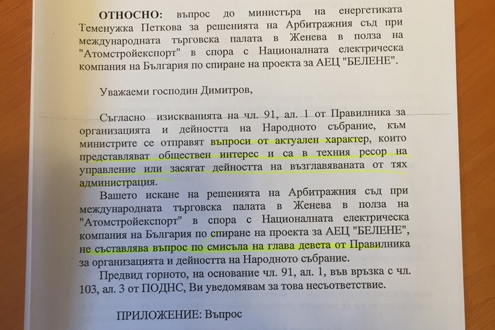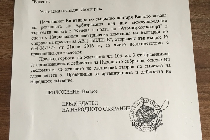 В рамките на 7 дни с резолюция на председателката на Народното събрание Цецка Цачева - от 21 и от 28 юли, парламентарният въпрос на депутата към енергийната министърка Теменужка Петкова е бил обявен за недопустим. Основанието - искането да се предостави решението на Арбитражния съд "не съставлява въпрос по смисъла на глава девета от Правилника за организацията и дейността на Народното събрание".