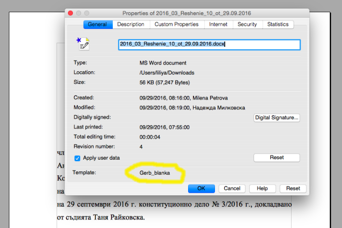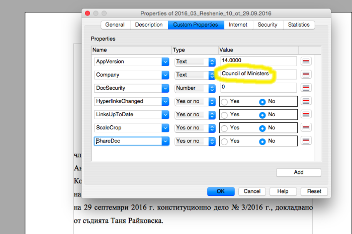 Проф. Борис Велчев, председател на Конституционния съд, обясни пред "Правен свят", че става дума за бланковия формат (темплейт) на Милена Петрова, която е секретар в КС. И всеки от двата параметъра на файла има съвсем просто обяснение, казва Велчев. "Gerb_blanka" не означава бланка на партия ГЕРБ, а бланка с герба на Конституционния съд. Що се отнася до отбелязването "Council of Ministers", то идва от факта, че когато е създадена бланката, КС и правителството, които делят една сграда, са имали и обща мрежа. Конституционният съд вече има свой сървър, посочва Велчев. Въпреки това повечето документи все още носят отбелязването.