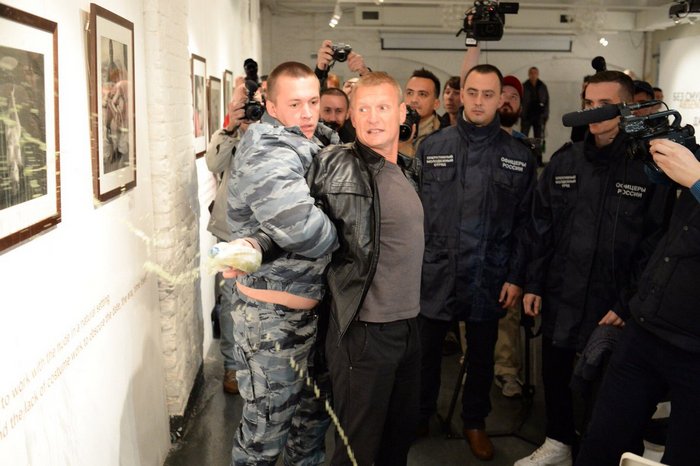 Малко по-рано същия ден входът на изложбата бе блокиран от активисти на движението, а един от тях заля с урина фотографиите на американския творец. Той бе арестуван заради вандалската си проява, а експозицията бе закрита.