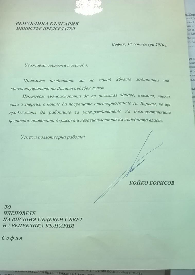 Тази седмица обаче чудесиите продължиха. На табло в съвета (аналогово) е бучната с кабарче съвсем оригинална честитка от премиера Бойко Борисов. Но това не е в общодостъпната му част - за медии, охрана, външни посетители и пр... Не е ясно и защо в ерата на е-комуникациите за поздравителния адрес от министър-председателя е избран този чаровно винтидж начин, че и е скрит от погледите освен на малцината богоизбрани в съдебната система.