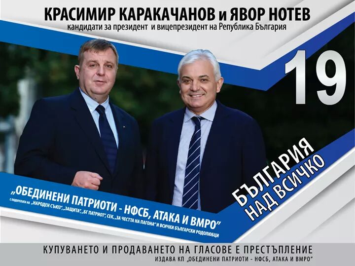 Националистическата двойка Каракачанов-Нотев също няма клип, но лидерът на ВМРО участва в социалните мрежи. Най-вече обаче Каракачанов обикаля и сее национализъм по места (изявите на Нотев са доста по-ограничени, може би не може да се откъсне от адвокатските си ангажименти). Без изненади е и лозунгът: "България над всичко". Вероятно, защото разчитат на други средства за въздействие (да не забравяме мощното оръжие на две партийни телевизии СКАТ и "Алфа", които неуморно облъчват), от кампанията на Каракачанов не са се постарали кой знае колко с оформлението на предизборния плакат. Там единственото важно е било сякаш да се изпишат имената на всички партии, които участват в коалицията за президентските избори - с всичките им разклонения и уточнения, както и подкрепящите родолюбиви, патриотични, националистически и т. н. важни формации. За двамата кандидати - колкото място е останало.