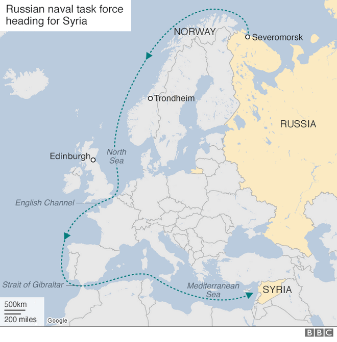 Русия праща корабите си в Средиземно море не само с цел усилване на огневата си мощ в Сирия, смята Би Би Си. Ако това е така, на Москва би й било по-лесно да прати повече бомбардировачи в базата си край пристанището Латакия. С изпращането на голяма флотилия през Северно море и Ламанша Москва отправя послание, че може да направи всичко, което прави Запада, че дори и по-добре.