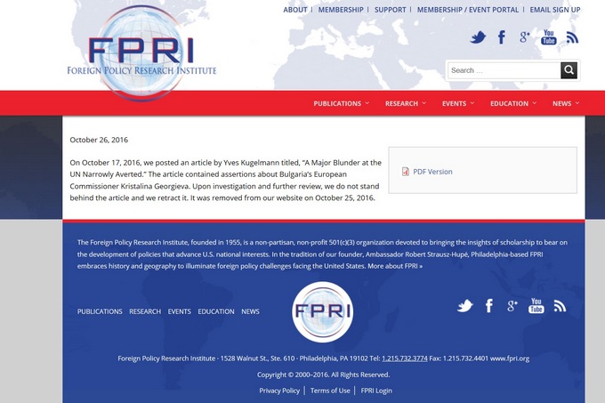 Изследователският институт за външна политика (FPRI) в САЩ свали от сайта си оклеветяващ материал за Кристалина Георгиева и евентуални нейни връзки с ДС и публикува извинение.
