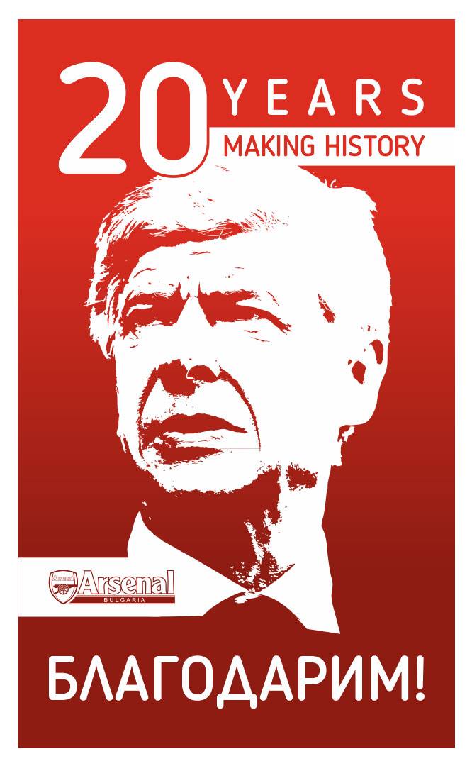 Първият съдийски сигнал на мача срещу "Лудогорец" ще е в 21,45 ч. Точно в 20-ата минута от срещата - в 22,05 ч секторът с фенове на топчиите е замислил изненада в знак на благодарност към треньора на "Арсенал" Арсен Венгер. Французинът е начело на тима от 20 години и по повод юбилея феновете са подготвили плакат-знаме с размер 9/15 метра с лика му, надпис "20 години правим история" и "Благодарим" на чист български език. Призивът към феновете в сектора за гости, които ще помагат за разгъването на огромното платно, е:
