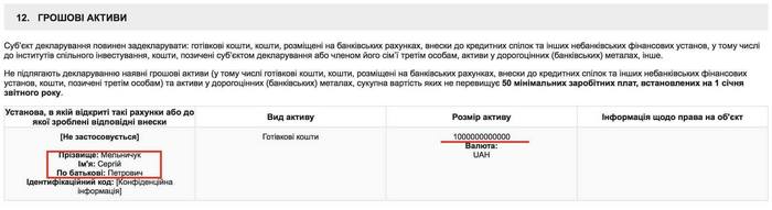 Още по-скандална е декларацията на Сергий Мелничук от парламентарната група "Воля на народа". Той обяви умопомрачителната сума от 1 трилион гривни, предаде агенция УНИАН. Това се равнява ни повече, ни по-малко на 35,6 милиарда евро. Малко по-късно съпартийци на Мелничук обясниха, че той си направил шега, която се оказала неудачна... Депутатът обещал да даде обяснения, но все още не го е направил. Има сериозна опасност той да загуби уважението на сънародниците си.