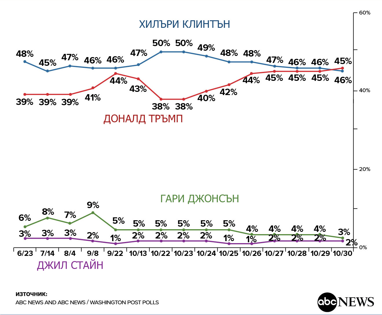 Особено впечатляващо е, че преди 10 дни проучване на ABC News даваше на бившата първа дама преднина със солидните 12%. Всичко обаче се промени след съобщенията, че ФБР се е сдобило със съдебна заповед да проучи новооткритите имейли, свързани с нея. Те бяха разпространени от осведомени източници, цитирани от Ройтерс. А по-късно и лично от шефа на ФБР Коми. Съдебната заповед ще позволи на ФБР да проучи имейлите, за да установи дали имат връзка с неговото разследване на частния сървър, използван за правителствени дела от Клинтън като държавен секретар на САЩ в периода 2009 до 2013 г.
