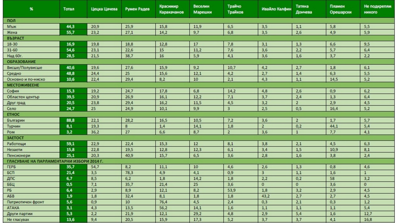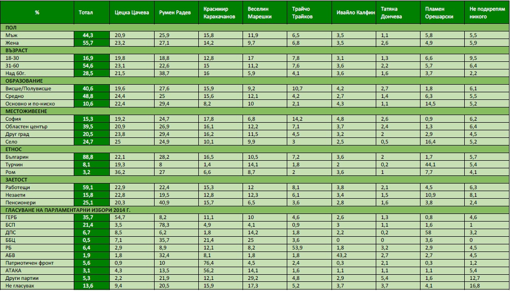 Цачева е взела 3,5% от избирателите на БСП, 8,5% от ДПС, 7,1% от ББЦ, 1,8% от АБВ, 0,9% от ПФ и 4,3% от "Атака". За Трайков са гласували 4,6% от избирателите на ГЕРБ, 0,9 от тези на БСП, 1,8 от ДПС, 3,6 от ББЦ, 1,8, от АБВ, 1,6 от "Атака".