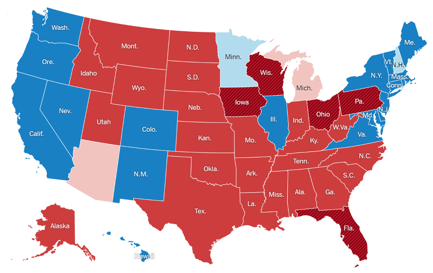 Това обаче не бе достатъчно и Тръмп се отправи към финалния щурм - спечели ключовия щат Флорида, а след като взе и щатите Джорджия и традиционно "синия" Пенсилвания, вече нищо не можеше да го спре. Той се доближи до необходимите 270 места в избирателната колегия. След това дойдоха победите в Уисконсин и Аризона и Тръмп премина границата.