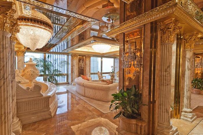 Апартаментът на Тръмп е в Ню Йорк, разположен на 66-ия етаж на собствения му небостъргач, кръстен на него - "Кулата Тръмп". Още от вратата гостите вече са впечатлени. Тя е от злато и диаманти.