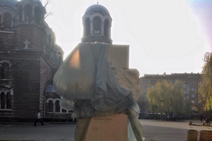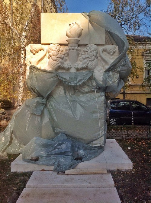 Необявен паметник никне в градинката на църквата „Свети Седмочисленици“ в центъра на София. Произведението е полуобвито с найлон, но онова, което се вижда от него, изглежда като три блока итонг, поставени един върху друг, като средният е напреки на останалите, така че да образува нещо като кръст. В него са издълбани релефно два оплезени лъва, подобни на животното от герба, които държат факел. На гърба на конструкцията е издълбан надпис „Вечна слава“.