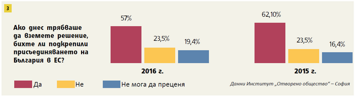 Промяната обаче за последната една година е малка. Даже неочаквано малка на фона на преживяното. На въпроса „Бихте ли подкрепили днес присъединяването на България към ЕС“ 57% отговарят с „Да“, а 23,5% с „Не“. Останалите 19,4% нямат мнение. Година по-рано подкрепата за членството в Европейския съюз беше малко по-висока – 62%, съответно неодобрението на този избор на България бе малко по-ниско – 21%.