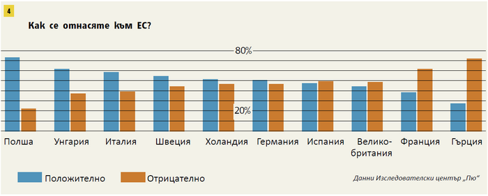 71% от избирателите в Гърция са негативно настроени към съюза, във Франция са 61%. И това откроява тези две страни от всички останали, където настроенията са или разделени поравно, или силно в полза на ЕС. На върха на еврооптимизма застават поляците, следвани от унгарците и италианците. Ако американският екип бе включил и България в изследването си, мястото ни щеше да е на върха редом до Полша, Унгария, Италия...