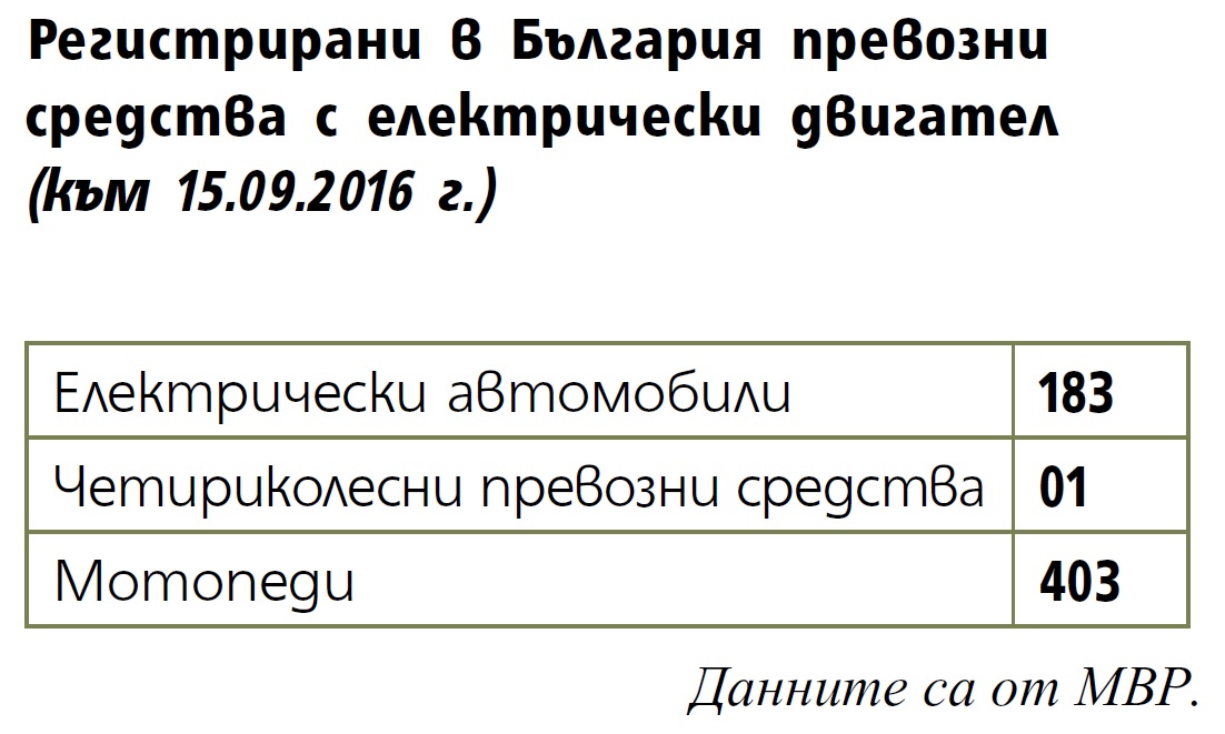 Такива думи може да чуете от всеки, който веднъж се е качил на електромобил или е направил решителната крачка да стане собственик на такъв. И въпреки това в България броят на електрическите автомобили по пътищата е сравнително малък. По данни на МВР към 15 септември 2016 година у нас са регистрирани 183 автомобила с електрически двигатели и още 101 четириколесни превозни средства – т.е. по-леки и развиващи скорост под 45 км/ч. Общо се получава числото, което всички ентусиасти използват – регистрираните електромобили са около 300. Отделно има 403 мотопеди изцяло на ток. В това число не влизат всички електрически коли, които се използват в търговски обекти, които не излизат от границите на дадено предприятие, които превозват багаж на летищата например, защото те не се движат по републиканската пътна мрежа.