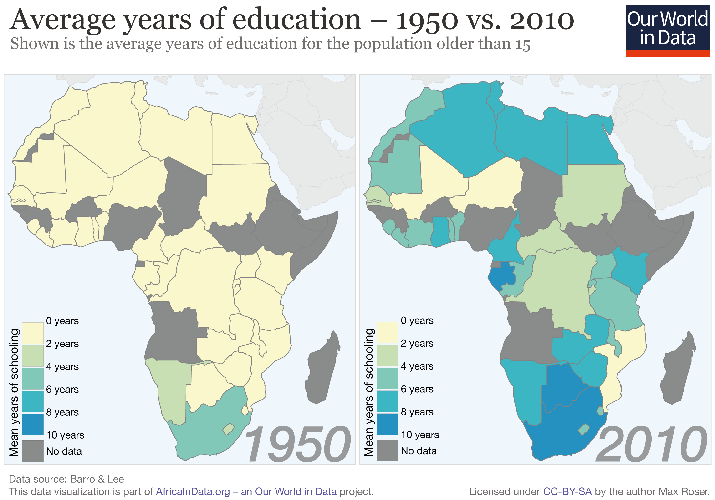Следващата карта измерва колко години е прекарал в система на образование средностатистическия жител на всяка африканска държава. Ако през 1950 г. само в Намибия и ЮАР човек е учил средно 2 или повече години, до 2010 г. само Мали, Нигер и Мозамбик са останали на същото ниво - поне за тези, за които има данни.