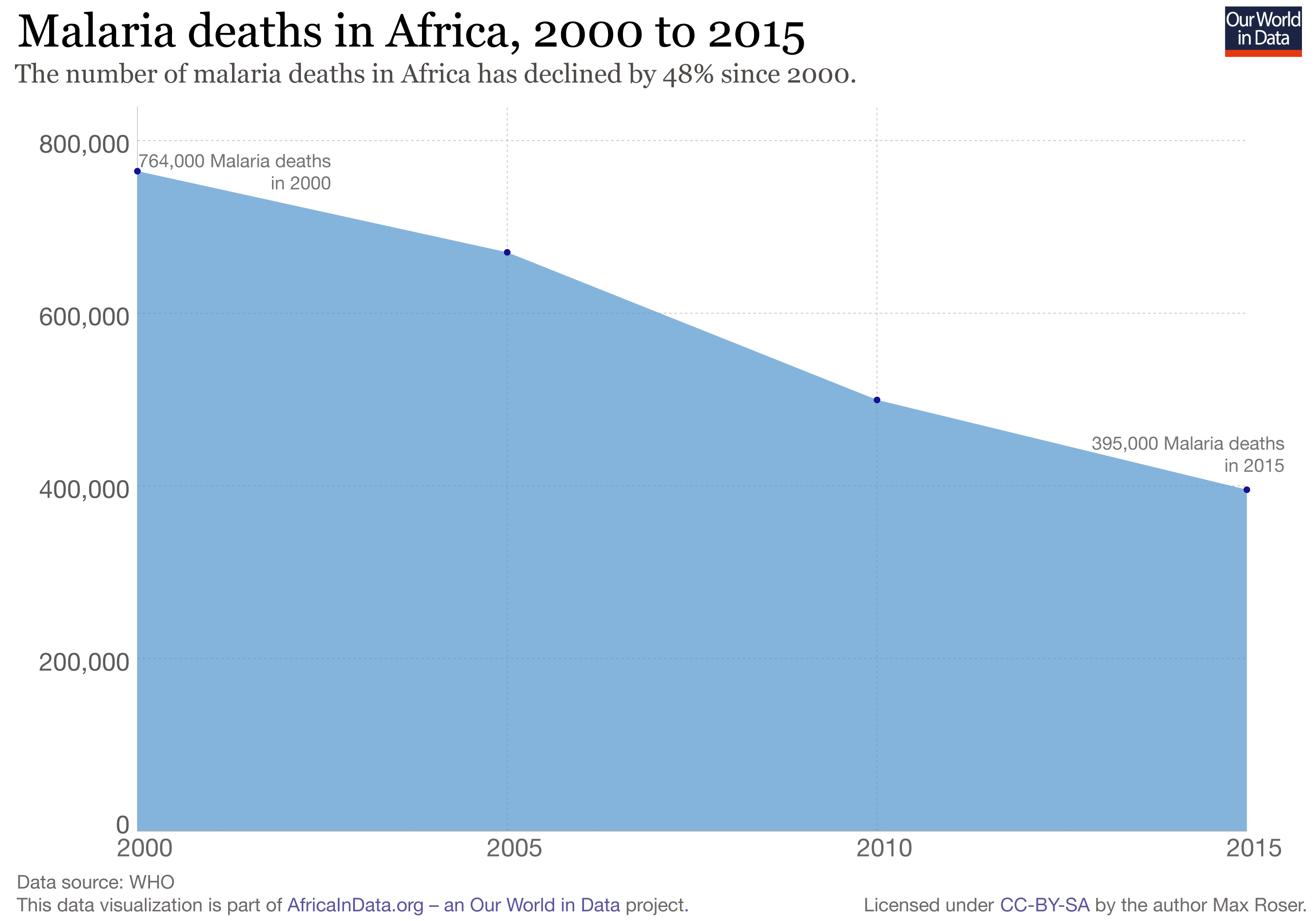 Друга легендарна болест на африканския континент - маларията - все още е активна. Заразява и убива хора всяка година. Но и борбата срещу нея върви с пълна сила, както показва следващата графика - само за 15 години смъртните случаи годишно намаляват почти наполовина. През 2000 г. от болестта умират 764 000 души, а през миналата - 395 000. С тези темпове до 2030 г да умреш от малария в Африка ще е също толкова рядко, колкото и в Европа.