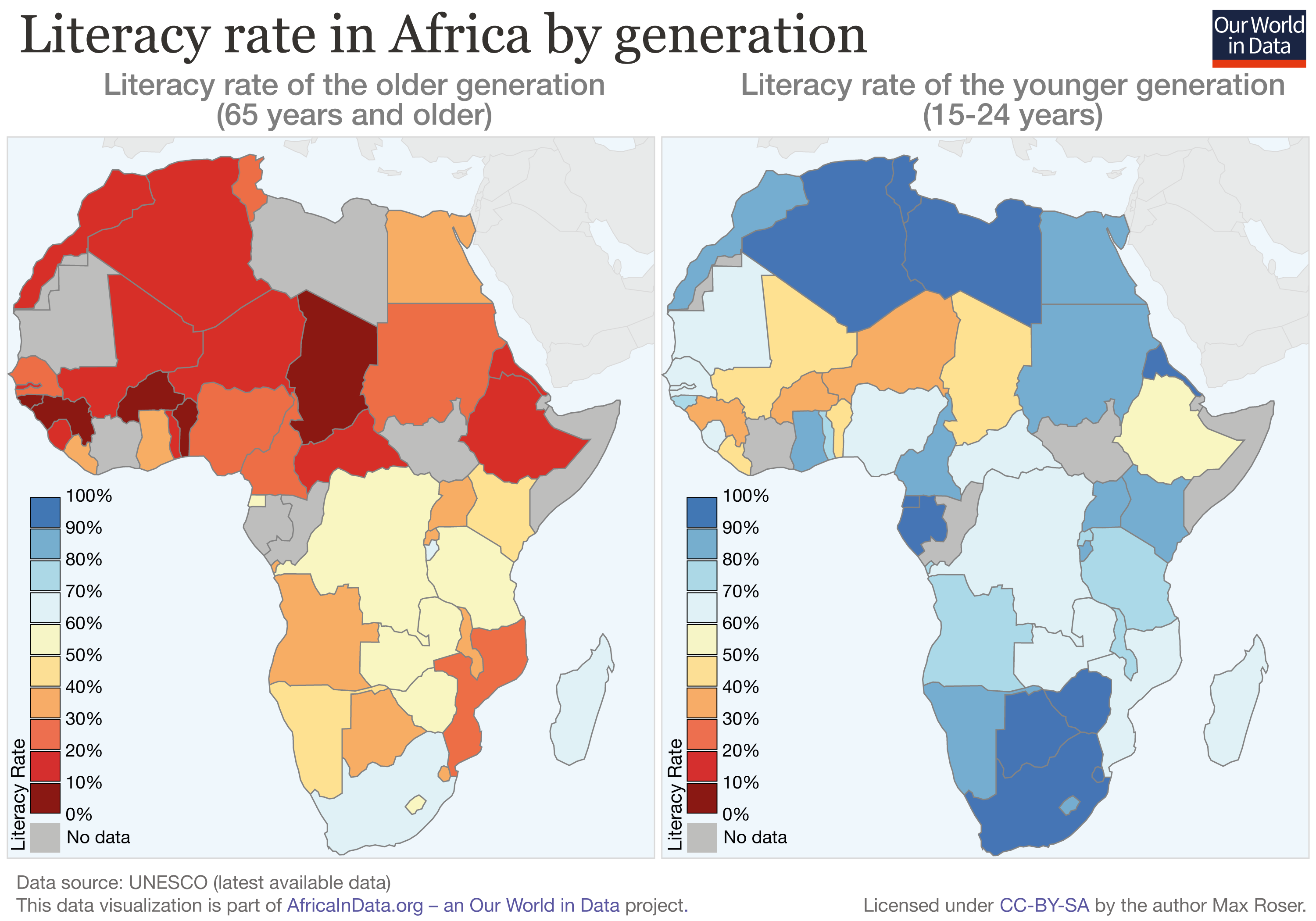 От това расте и грамотността - както може да се види на долната карта, поколението над 65 г е в голяма степен неграмотно. Младите обаче - между 15 и 24 - в повечето държави са над 70% грамотни.