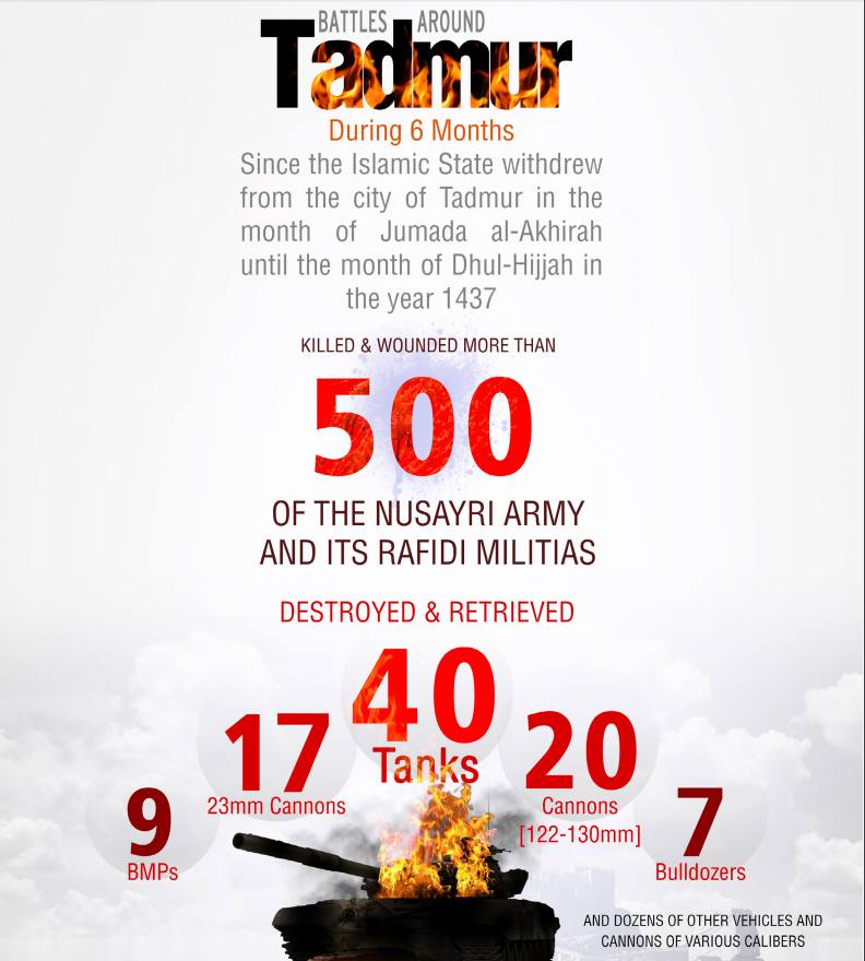 Немалко страници са отделени и за героично описване на успешни операции и кампании на ИД, както в кратки информационни бележки за всяка държава, така и в големи инфографики, описващи колко са избити и каква техника е пленена или унищожена в „Багдадския оружай“, „Битките около Тадмур“ и други.