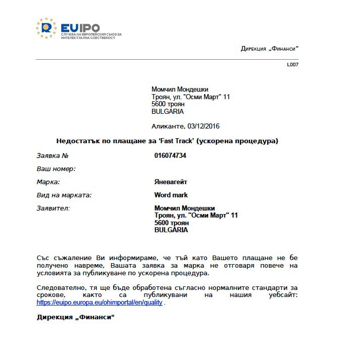 Това предполага, че ако Мондешки стане собственик на „Яневагейт“ той може да претендира, включително пред интернет търсачките, да бъдат свалени всички статии и линкове към тях, които съдържат това име. Ловешкият адвокат е бързал с регистрацията и е поискал тя да мине по бърза процедура, но не е платил навреме и това му е било отказано. Ето защо публикацията излиза чак сега.