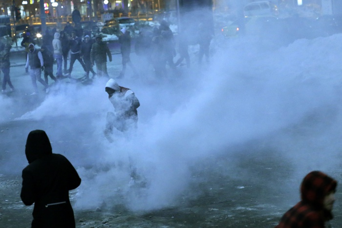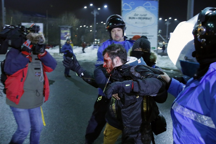Според медиите в Румъния напрежение по време на протеста не е имало до полунощ. След това обаче е имало сблъсъци първо между силите на реда и привърженици на клуба "Динамо"-Букурещ, които излизали от хандбален мач със "Стяуа", съобщи телевизия Digi24. Резултатът - провокациите на запалянковците, които започнали да замерят с бутилки, камъни и горящи факли органите на реда. В отговор протестът е бил разпръснат със сълзотворен газ, сблъсъци с жандармерията и нападение срещу мирно протестиращите от страна на привърженици на "Динамо" (Букурещ). Има ранени, но не е ясно дали това е резултат от действията на полицията или на провокаторите - данните са противоречиви.