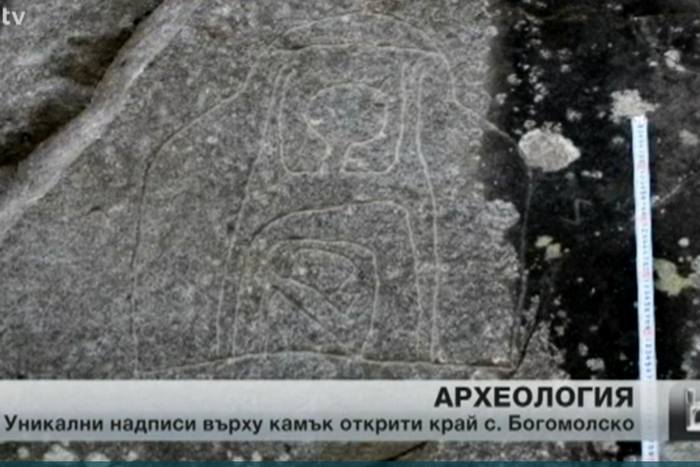 В репортажът, който можете да гледате тук, проф. Ангел Конаклиев показва и интерпретира пред камера мистични знаци-рисунки, или петроглифи, открити въру каменна стена в крепост до с. Богомолско, Североизточна България.