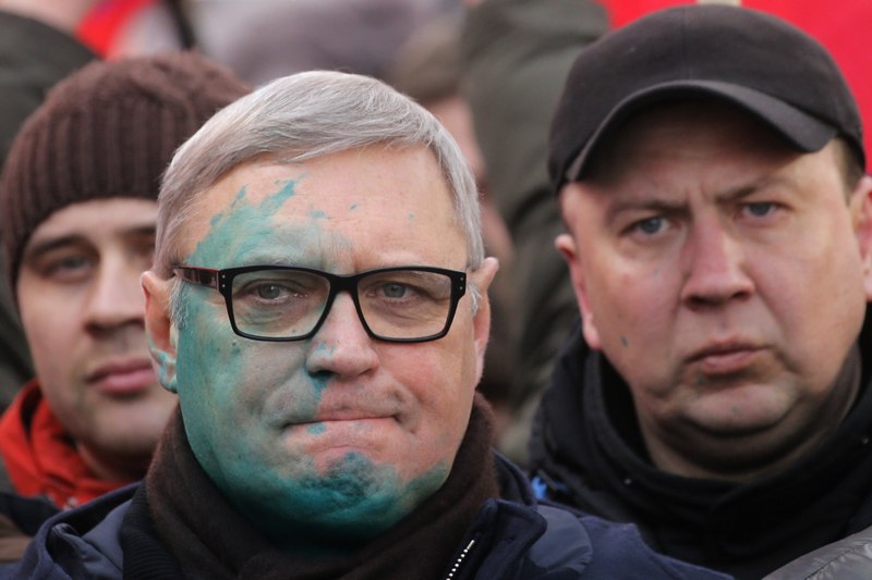 Михаил Касянов, премиер в първия мандат на президента Владимир Путин и настоящ лидер на една от опозиционните партии, бе залят със зелена боя от провокатор. Докато полицията отвеждаше нарушителя, той викаше "Русия е с Путин".