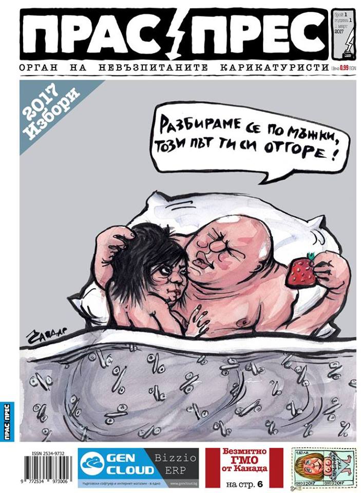 След сериозно търсене в центъра на София и някои близки квартали, „Площад Славейков“ успя да се сдобие с един брой. Открихме го на културно място, разбира се – „Дюкян Меломан“. Също като френското острие на сакразма „Шарли Ебдо“, и нашият „Прас-прес“ е в неголям обем – 8 страници, но като колегите си в Париж, и нашите ще докарат силен гняв на своите герои. Вестникът започва с Корнелия Нинова (заедно с Бойко Борисов в леглото) и завършва с Корнелия Нинова – садо-мазо бомба, забила токчета върху канадското знаме…