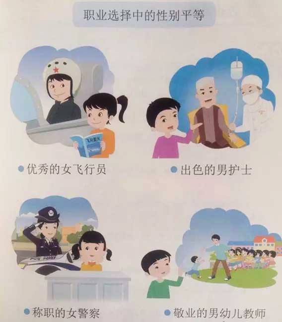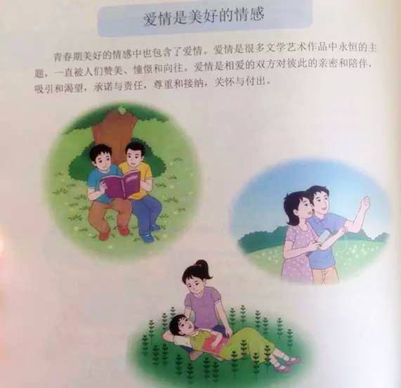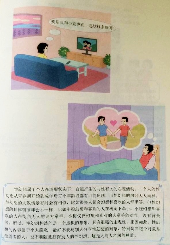 В учебниците са илюстрирани и бракове между хомосексуални. От тях децата научават, че в някои държави те могат да се женят, макар в Китай "не могат да се регистрират в момента". Освен това, хомосексуалните имат право и да стават родители.