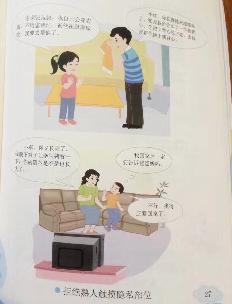 Има и секция за "неуместно докосване", в което се обяснява на учениците, че такова може да не е само от непознат, а и от роднини, както и че сексуалните насилници могат да са и мъже, и жени.