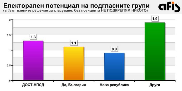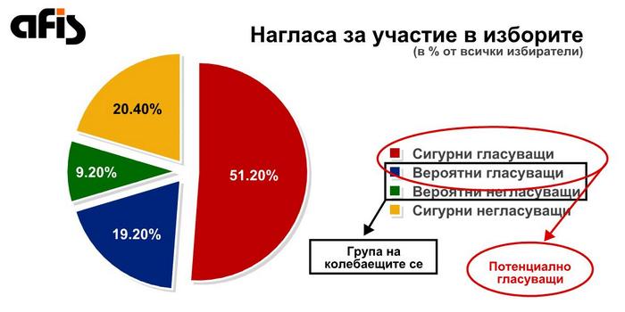 Делът на онези избиратели, които ще упражнят правото си „насила“, сиреч заради въведеното задължително гласуване и ще изберат позицията „Не подкрепям никого“ възлиза на около 6%, но както знаем от опита на президентските избори, този дял в анкетна ситуация е двойно надценен. С други думи сборът на гласовете, които ще бъдат разпределени между участващите в изборите партии и коалиции ще бъде между 95 и 97 процента, при условие, че се намали чувствително за сметка на традиционните за последните изборни кампании недействителни гласове.