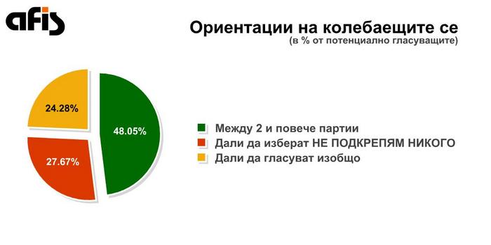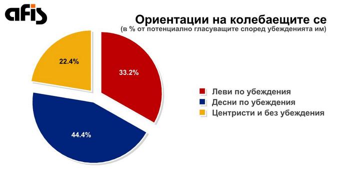 Най-голям интерес към този момент представлява групата на колебаещите се избиратели, които ще вземат решение за кого да гласуват или дали да гласуват изобщо в последния момент. Данните свидетелстват, че близо половината от представителите на тази група „хитруват“ в анкетна ситуация и по-скоро не биха гласували. Останалите около 15% от всички избиратели обаче са необичайно висок и твърде съществен дял, за да бъдат пренебрегвани в анализа. От данните личи, че десните избиратели са сравнително по-разколебани от левите, но изборът вляво е и по-стеснен и сведен основно до две възможности – БСП или коалицията „АБВ – Движение 21“, докато дясното пространство изобилства от партии и коалиции, включително и такива, които не се самоопределят като десни (Марешки), но на пропагандно ниво се представят като радикални противници на левицата.