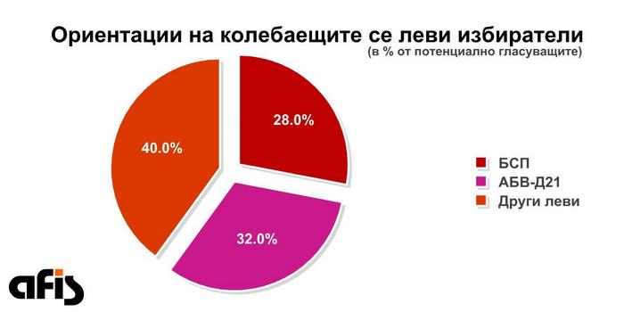 В какви посоки се колебаят левите избиратели? Основно между БСП и АБВ и Движение 21, като мнозина се оглеждат и в страни от двете възможности, но те е по-вероятно изобщо да не участват във вота.