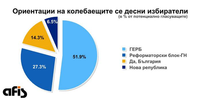 За разлика от левите десните избиратели се колебаят предимно в полза на ГЕРБ, макар че видимо симпатиите им не са на страната на Бойко Борисов. Все пак опасността гласът им да отиде на вятъра, подаден за формации, които нямат практически шансове за успех, може да ги мотивира в последния момент да пуснат някой друг глас „с отвращение“ за ГЕРБ в ситуация, при която изборите може да бъдат спечелени от техния изконен враг – БСП. И това обаче е слабо вероятно. По-скоро десният вот ще се разпръсне между множеството субекти, част от които ще останат със сигурност извън следващия парламент.
