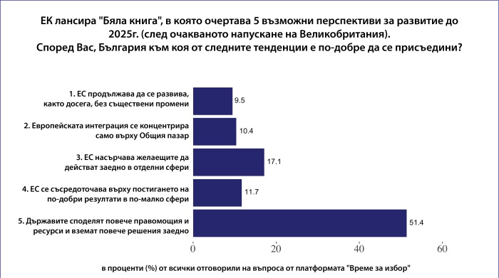 Мнозинството от тези граждани са се ориентирали към петия сценарий от Бялата книга – 51,4 % са посочили него като желаното от тях бъдещо развитие на ЕС. С най-ниска подкрепа - 9,5 % -се ползва вариантът „без промяна“, първият от предложените сценарии на развитие. Това е и вариантът, който като че ли бе представен като българска позиция на срещите и при консултациите, предшестващи срещата в Рим на 25 март 2017 година, посветена на 60-ата годишнина от подписването на Римския договор. Поне така звучи заявката на президента Румен Радев, който потвърди "ясната българска позиция в подкрепа на основополагащите ценности на ЕС – единството и солидарността и да се противопоставя на тенденцията за Европа на две скорости – за формирането на център и периферия"
