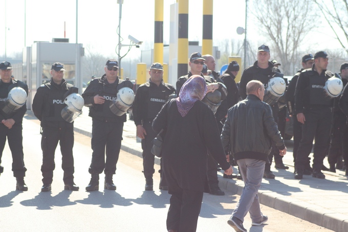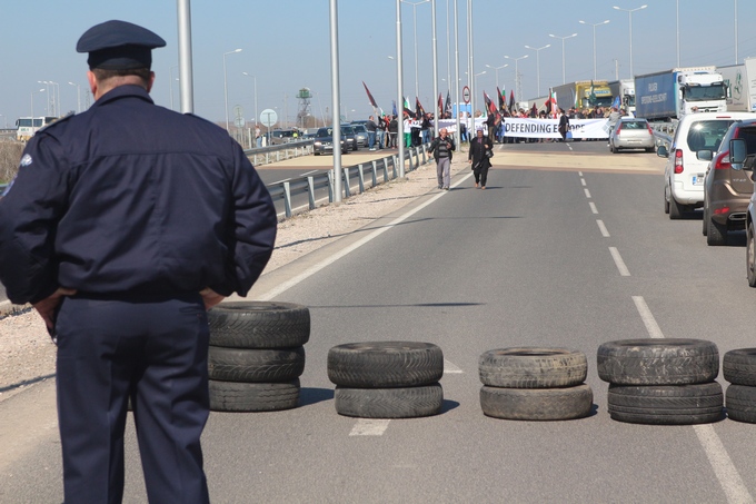 Протестиращите издигнаха плакати "Браним България, браним Европа!" Те застанаха на трасето "вход" за леки автомобили и автобуси, идващи от Капъкуле. Платното бе барикадирано с автомобулни гуми. Бяха запалени и няколко факли.