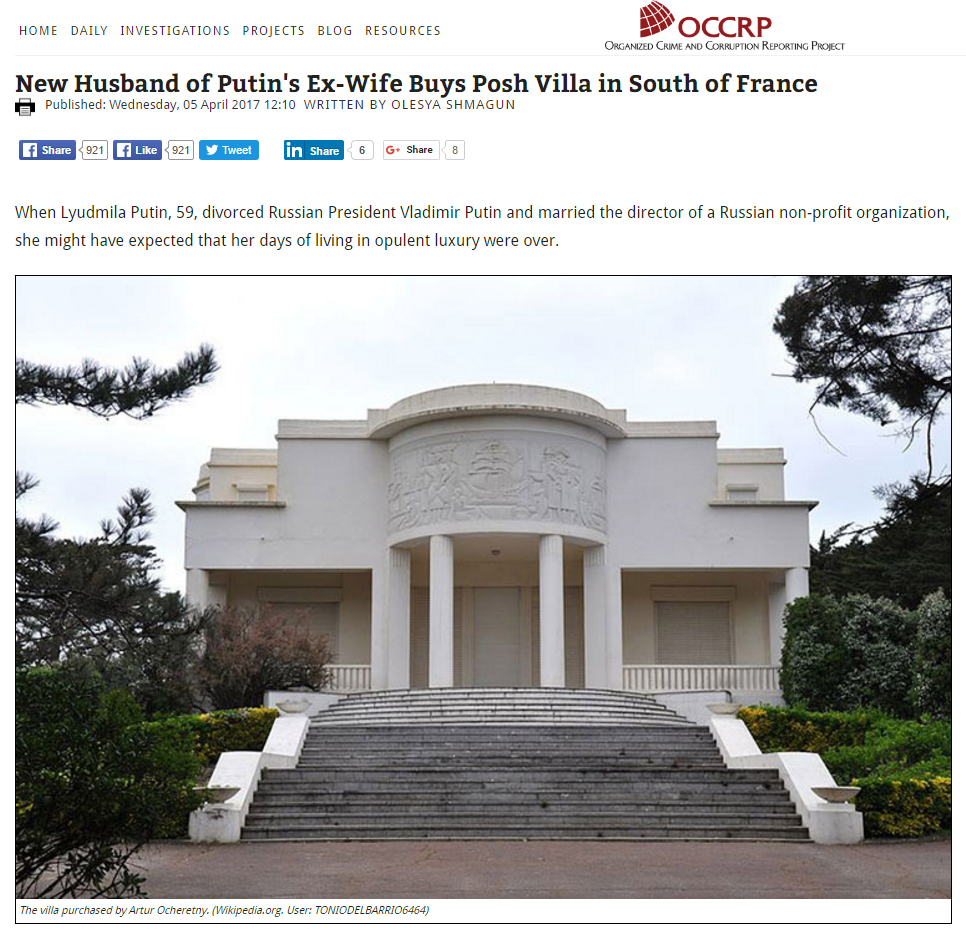 Връзките с европейската вила излязоха наяве в сряда, когато Проектът за докладване на организирана престъпност и корупция (OCCRP) публикува статия, в която се изказва предположението, че Очеретни е собственик на мини дворец в село на име Англе, близо до Биариц в южна Франция, който струва 7,46 млн. долара и е претъряпл солидно обновление. Вилата е била купена шест месеца след като сем. Путини съобщи за своя развод.