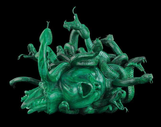 Нужен е гений, за да изтласка кича до точката, отвъд която той се превръща в нещо възвишено. Кунс, героят на Хърст, бе направил нещо като куче от гигантски огледални балони. Тук кичът увива пипалата си около вас и ви завлича надолу в подводния си дворец. След първия неправдоподобно фалшив на портрет неизвестен фараон, Джоунс бил отвратен. След стая, последвана от много стаи, пълни с всичко – от римски сервизи за хранене (предполагаеми), до масивна, покрита с корали статуя на многоръка жена (Кали), която се бори с гърчеща се многоглава Хидра, критикът изпаднал в опиянение.